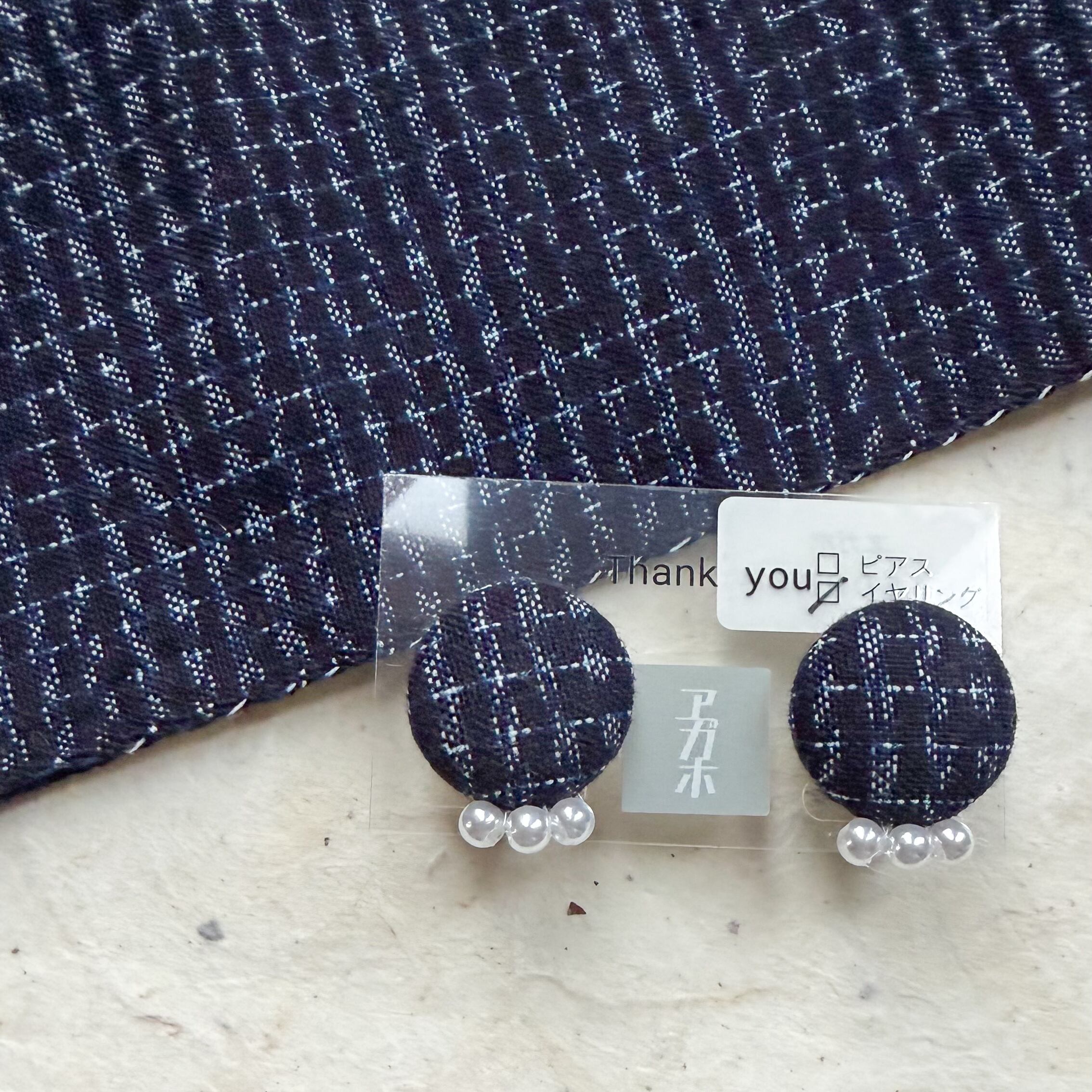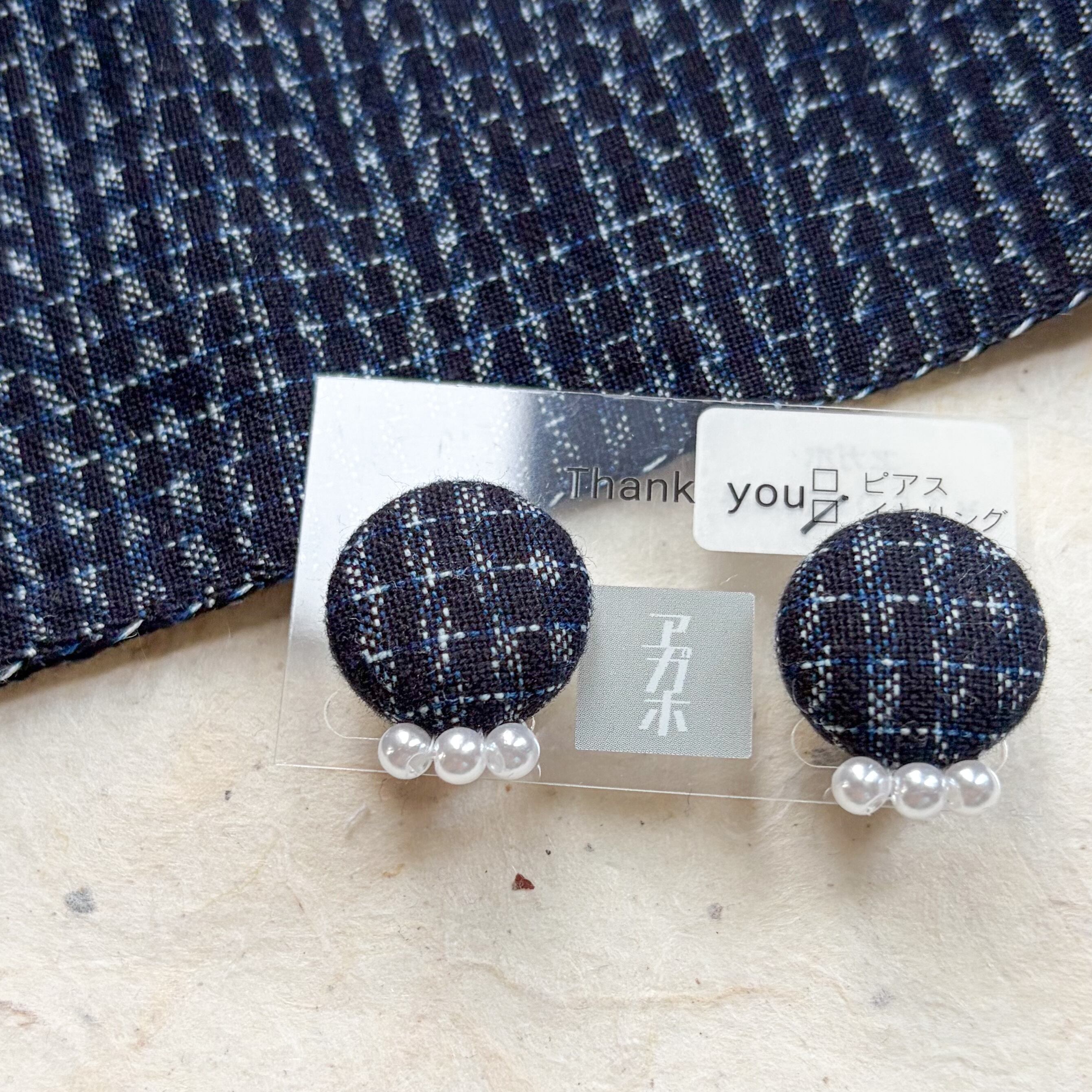 ピアス、イヤリング共にくるみボタン裏も久留米絣でカバーしています。直接お耳に当たらない仕様になっています。(※金属アレルギーに配慮した素材を使用しています)